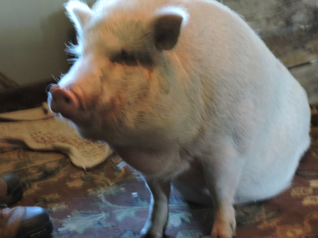 Older pigs who are too big to hold and are unsure of car routine you can do shorter trips and praise letting out via ramp to potty and praise. Slowly make trip longer. Pigs normally won’t go in vehicle if trained. If training for crate in vehicle adding blankets and going on small adventures will make pig look forward to going places. Walking up ramp, praise, treat, in cage, lock praise treats and country music.